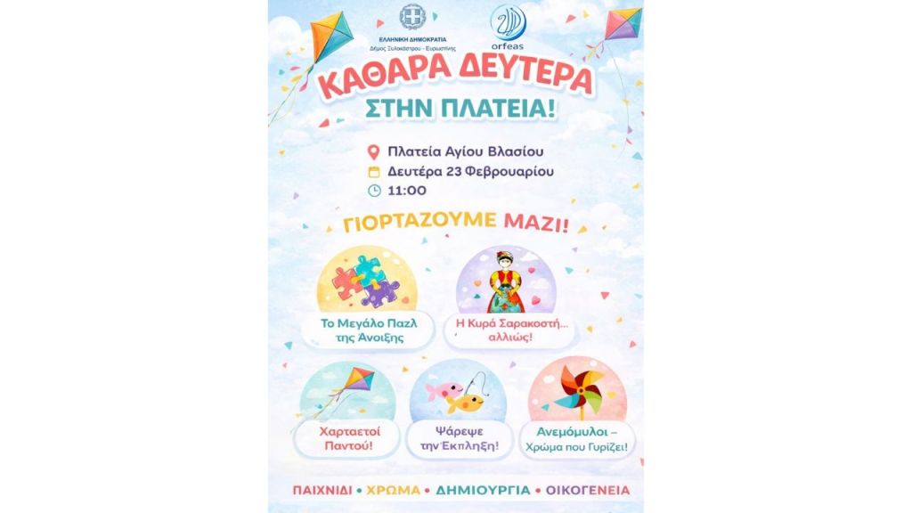 Ο Δήμος Ξυλοκάστρου - Ευρωστίνης και ο «Orfeas Organization» προσκαλούν μικρούς και μεγάλους να γιορτάσουν όλοι μαζί την Καθαρά Δευτέρα, σε μια ημέρα γεμάτη παιχνίδι, χρώμα και δημιουργία.
