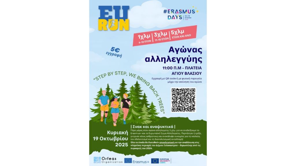 Ο ΟΡΦΕΑΣ Α.Μ.Κ.Ε., στο πλαίσιο των Erasmus Days 2025, διοργανώνει αγώνα δρόμου <EU RUN> στο Ξυλόκαστρο Κορινθίας με σκοπό την προώθηση της αθλητικής συμμετοχής, ενίσχυση της τοπικής κοινωνίας και αλληλεγγύης.