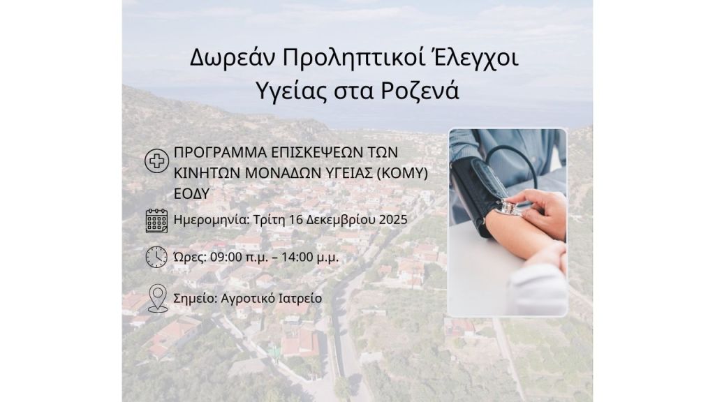 Ο Δήμος Ξυλοκάστρου -Ευρωστίνης, σε συνεργασία με το Υπουργείο Υγείας, τις Κινητές Ομάδες Υγείας (ΚΟΜΥ) του Εθνικού Οργανισμού Δημόσιας Υγείας (ΕΟΔΥ) και τις Υγειονομικές Περιφέρειες (ΥΠΕ) ανακοινώνει την έναρξη προγράμματος επισκέψεων προληπτικού ελέγχου και ενημέρωσης σε οικισμούς του Δήμου, με στόχο την ενίσχυση της πρωτοβάθμιας φροντίδας και την ισότιμη πρόσβαση όλων των δημοτών σε βασικές υπηρεσίες υγείας.