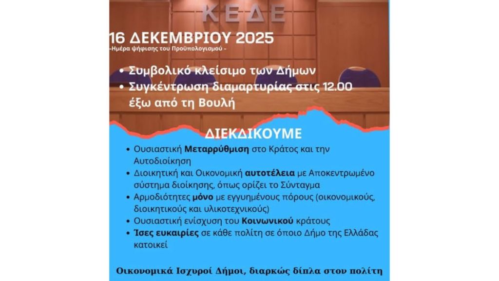 Ο Δήμος Ξυλοκάστρου - Ευρωστίνης συμμετέχει στο κάλεσμα της ΚΕΔΕ για συμβολικό κλείσιμο των υπηρεσιών την Τρίτη 16 Δεκεμβρίου 2025