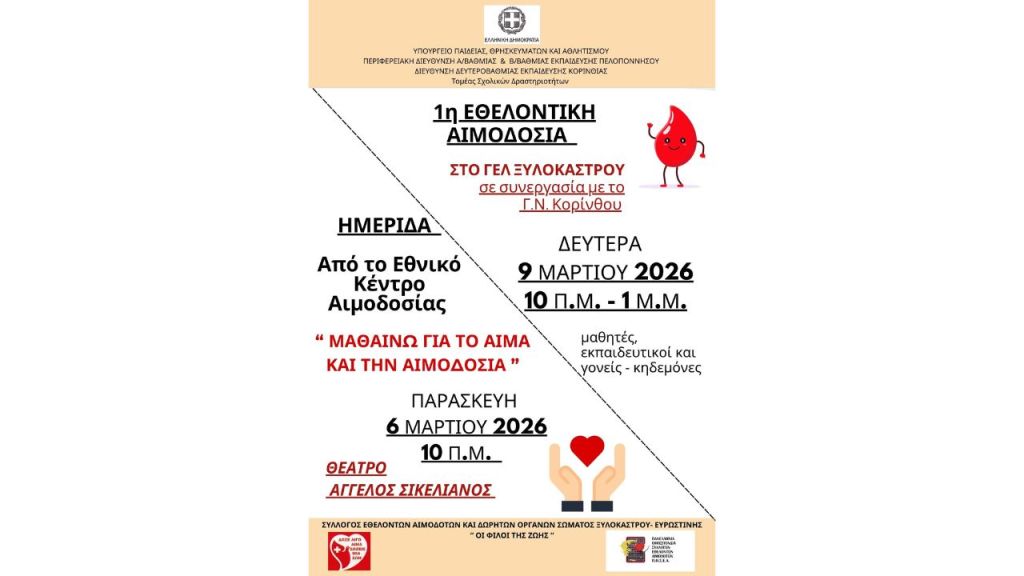 Το ΓΕΛ Ξυλοκάστρου, σε συνεργασία με το Γ.Ν. Κορίνθου και τον Σύλλογο Εθελοντών Αιμοδοτών και Δωρητών Οργάνων Σώματος Ξυλοκάστρου-Ευρωστίνης «Οι Φίλοι της Ζωής», διοργανώνει ένα σημαντικό διήμερο δράσεων με στόχο την ενημέρωση και την ενίσχυση της εθελοντικής αιμοδοσίας.