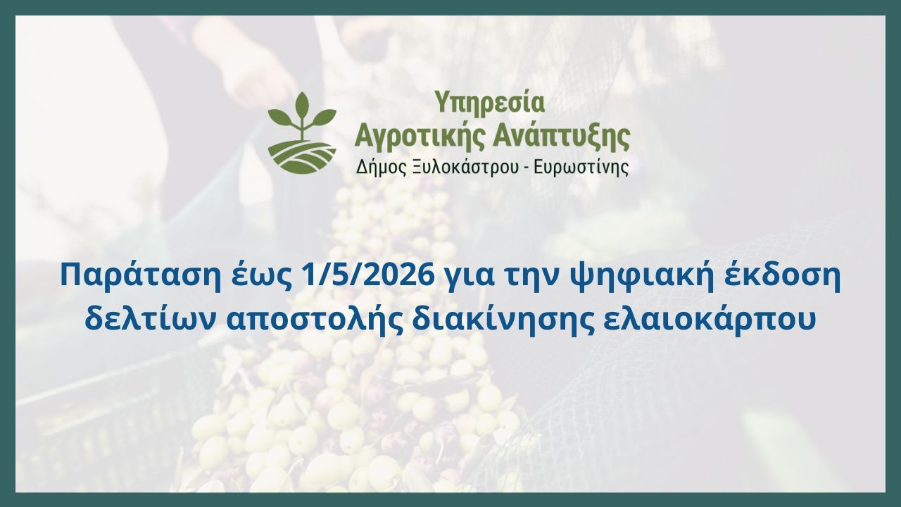 Ο Δήμος Ξυλοκάστρου – Ευρωστίνης ανακοινώνει με ιδιαίτερη ικανοποίηση την ολοκλήρωση και ενεργοποίηση της νέας διαδικτυακής πλατφόρμας της Υπηρεσίας Αγροτικής Ανάπτυξης, η οποία τίθεται πλέον στη διάθεση των παραγωγών και όλων των φορέων του πρωτογενούς τομέα της περιοχής.
