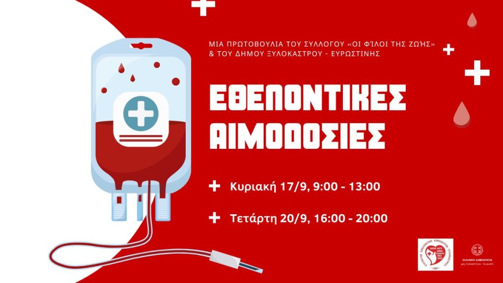 Γι’ αυτό τον λόγο, ο Σύλλογος Εθελοντών Αιμοδοτών Ξυλοκάστρου-Ευρωστίνης «Οι Φίλοι της Ζωής», σε συνεργασία με τον Δήμο Ξυλοκάστρου-Ευρωστίνης, πραγματοποιούν Εθελοντικές Αιμοδοσίες στα γραφεία μας, στην οδό Αγίου Βλασίου 20, στο Ξυλόκαστρο: