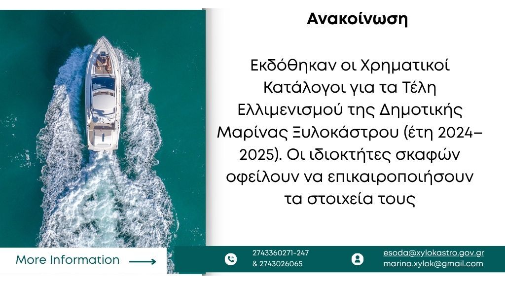 Σας ενημερώνουμε ότι εκδόθηκαν οι Χρηματικοί Κατάλογοι με τις χρεώσεις για τα Τέλη Ελλιμενισμού της Δημοτικής Μαρίνας Ξυλοκάστρου.