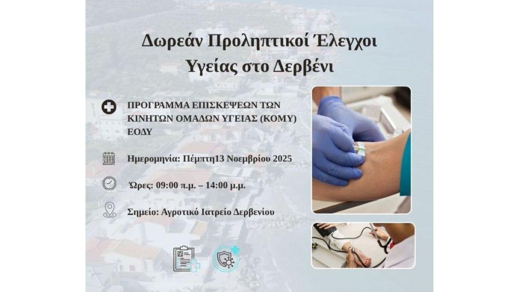 Ο Δήμος Ξυλοκάστρου -Ευρωστίνης, σε συνεργασία με το Υπουργείο Υγείας, τις Κινητές Ομάδες Υγείας (ΚΟΜΥ) του Εθνικού Οργανισμού Δημόσιας Υγείας (ΕΟΔΥ) και τις Υγειονομικές Περιφέρειες (ΥΠΕ) ανακοινώνει την έναρξη προγράμματος επισκέψεων προληπτικού ελέγχου και ενημέρωσης σε οικισμούς του Δήμου, με στόχο την ενίσχυση της πρωτοβάθμιας φροντίδας και την ισότιμη πρόσβαση όλων των δημοτών σε βασικές υπηρεσίες υγείας.