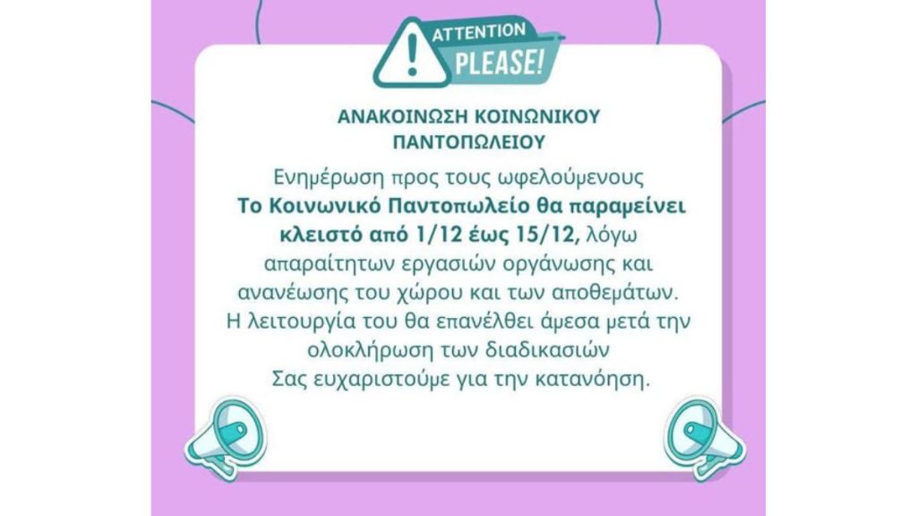 Ενημερώνουμε τους ωφελούμενους ότι το Κοινωνικό Παντοπωλείο του Δήμου θα παραμείνει κλειστό από 1 Δεκεμβρίου έως και 15 Δεκεμβρίου, λόγω απαραίτητων εργασιών οργάνωσης και ανανέωσης του χώρου και των αποθεμάτων.