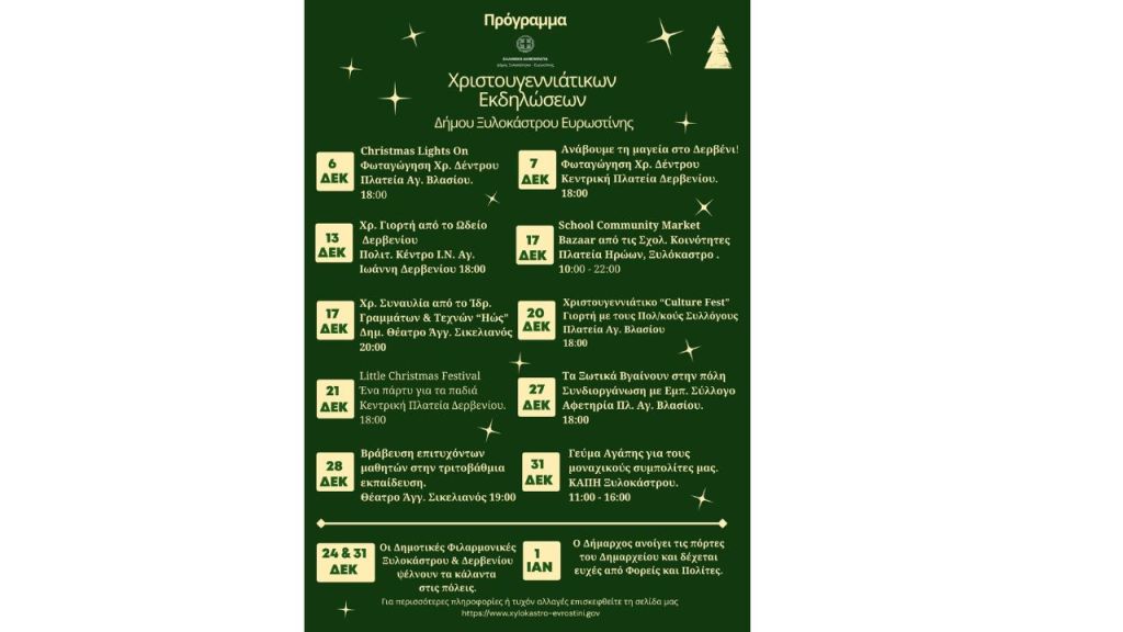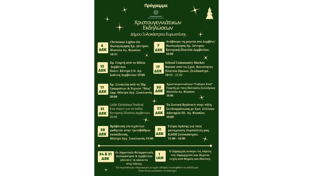 Πρόγραμμα Χριστουγεννιάτικων Εκδηλώσεων 2025 Δήμος Ξυλοκάστρου – Ευρωστίνης