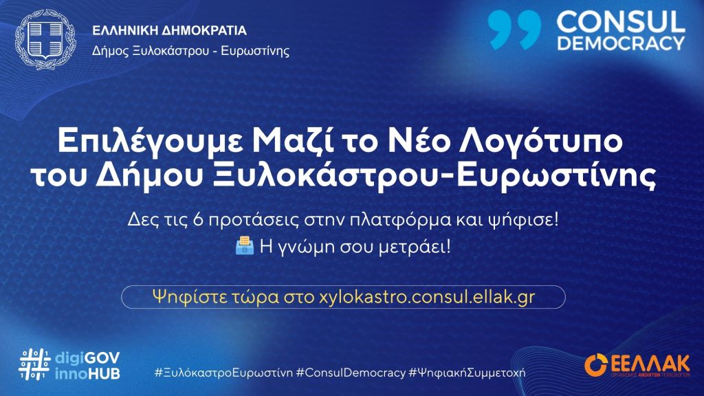 Μέσα από την πλατφόρμα Consul Democracy, που εφαρμόζεται πιλοτικά στο πλαίσιο του μνημονίου συνεργασίας με τον Ευρωπαϊκό Κόμβο Ψηφιακής Καινοτομίας GR digiGOV-innoHUB και σε συνεργασία με την ΕΕΛΛΑΚ, οι δημότες έχουν τη δυνατότητα να ψηφίσουν και να επιλέξουν το νέο λογότυπο του Δήμου μας. Στη διάθεσή σας υπάρχουν έξι προτάσεις λογοτύπων, καθεμία με εικόνα υψηλής ποιότητας και περιγραφή της ιδέας πίσω από τον σχεδιασμό. Αφού εγγραφείτε στην πλατφόρμα, μπορείτε να δείτε τις επιλογές και να ψηφίσετε το λογότυπο που θεωρείτε ότι εκφράζει καλύτερα τον Δήμο μας. Η ψηφοφορία θα διαρκέσει από 18/12/2025 έως 31/01/2026 (συνολικά 6 εβδομάδες). Τα αποτελέσματα θα είναι δημόσια και θα ενημερώνονται σε πραγματικό χρόνο. Η συμμετοχή σας είναι σημαντική για να δημιουργήσουμε μαζί μια σύγχρονη και αντιπροσωπευτική εικόνα για τον Δήμο μας!