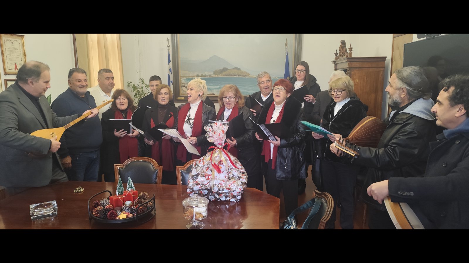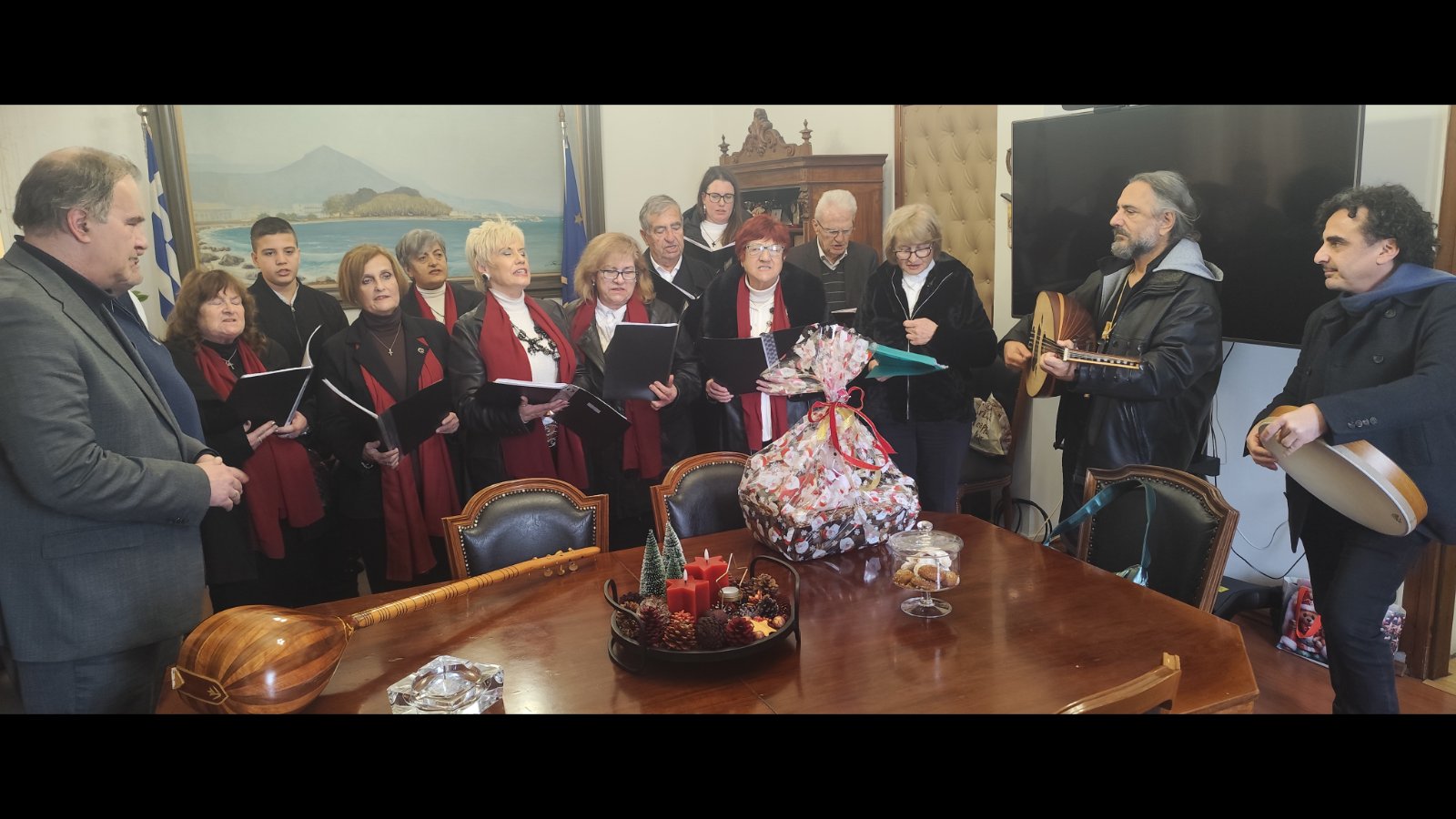 Τα μέλη του Συλλόγου έψαλαν τα χριστουγεννιάτικα κάλαντα, μεταφέροντας το εορταστικό κλίμα και τις ευχές τους για τη νέα χρονιά. Παράλληλα, προσέφεραν στον Δήμαρχο ένα καλάθι με δώρα, ως ένδειξη εκτίμησης.