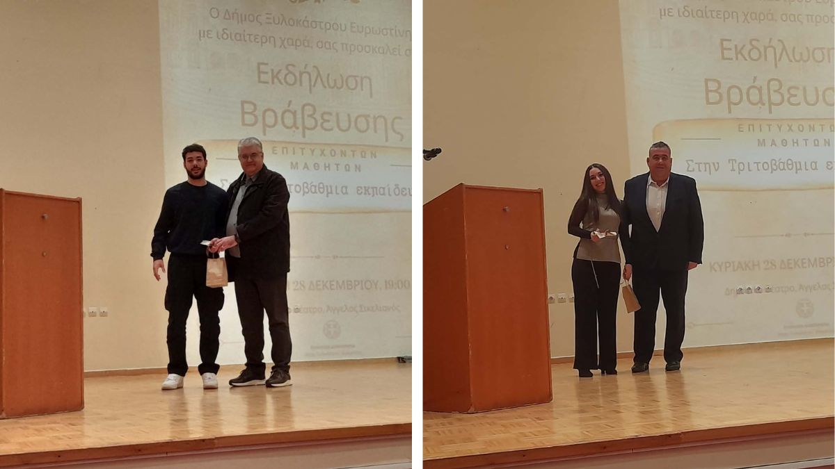 Με επιτυχία πραγματοποιήθηκε την Κυριακή 28 Δεκεμβρίου 2025, στο Δημοτικό Θέατρο «Άγγελος Σικελιανός», η τελετή βράβευσης των μαθητών του Δήμου Ξυλοκάστρου – Ευρωστίνης που πέτυχαν την εισαγωγή τους στην Τριτοβάθμια Εκπαίδευση.