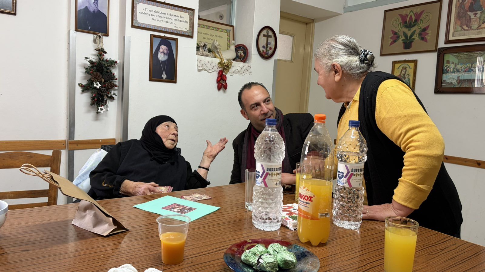 Αρχικά, πραγματοποιήθηκε επίσκεψη στον οίκο ευγηρίας «Αγία Ελένη» της Ιεράς Μονής του Οσίου Παταπίου, όπου έγινε ανταλλαγή ευχών με τον Σεβασμιότατο Μητροπολίτη Κορίνθου, Σικυώνος, Ζεμενού, Ταρσού κ Πολυφέγγους κκ. Παύλου Β'. Κατά τη διάρκεια της επίσκεψης παραδόθηκαν δέματα με είδη ρουχισμού και τρόφιμα για τις φιλοξενούμενες, ενώ ακολούθησε περιήγηση στους χώρους και εγκάρδια ανταλλαγή ευχών με τις φιλοξενούμενες, σε κλίμα συγκίνησης και ζεστασιάς.