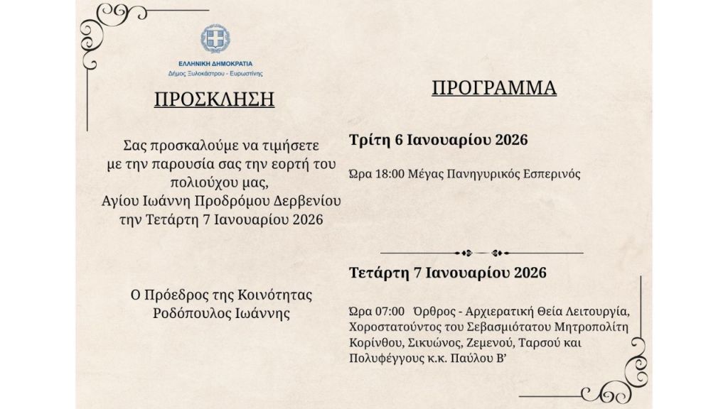 Η Δημοτική Κοινότητα Δερβενίου σας προσκαλεί να τιμήσετε με την παρουσία σας την εορτή του πολιούχου μας, Αγίου Ιωάννη Προδρόμου, την Τετάρτη 7 Ιανουρίου 2026.