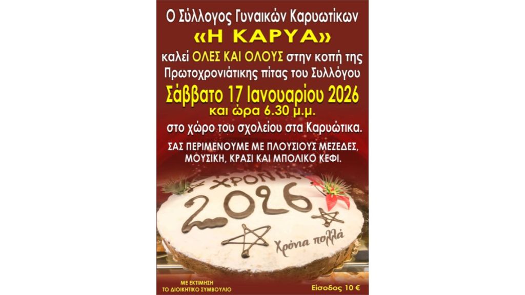 Ο Σύλλογος Γυναικών Καρυωτίκων «Η ΚΑΡΥΑ» σας προσκαλεί στην καθιερωμένη εκδήλωση για την κοπή της Πρωτοχρονιάτικης πίτας του Συλλόγου.