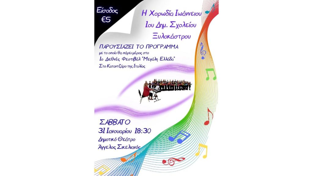 Η Παιδική Χορωδία του 1ου Δημοτικού Σχολείου Ξυλοκάστρου «Ιωάννειο» διοργανώνει μια ξεχωριστή μουσική εκδήλωση το Σάββατο 31 Ιανουαρίου 2026, στις 18:30, στο Δημοτικό Θέατρο “Άγγελος Σικελιανός”, στο Ξυλόκαστρο.