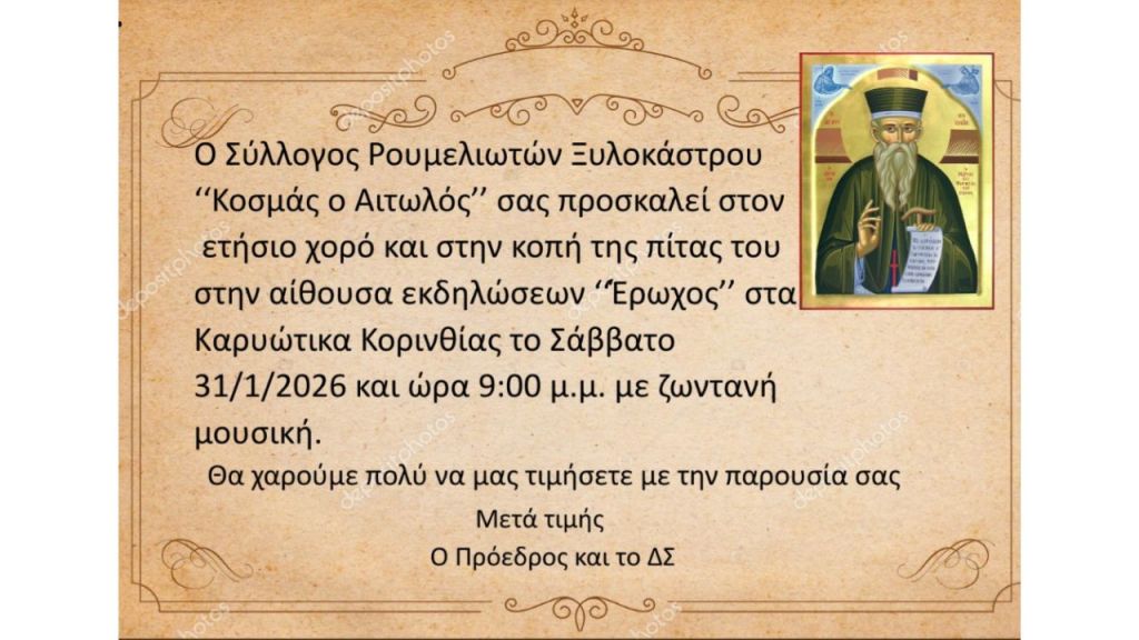 Ο Σύλλογος Ρουμελιωτών Ξυλοκάστρου “Κοσμάς ο Αιτωλός” σας προσκαλεί στον ετήσιο χορό και στην κοπή της πίτας του στην αίθουσα εκδηλώσεων “Έρωχος” στα Καρυώτικα Κορινθίας το Σάββατο 31/1/2026 και ώρα 9:00 μ.μ. με ζωντανή μουσική.