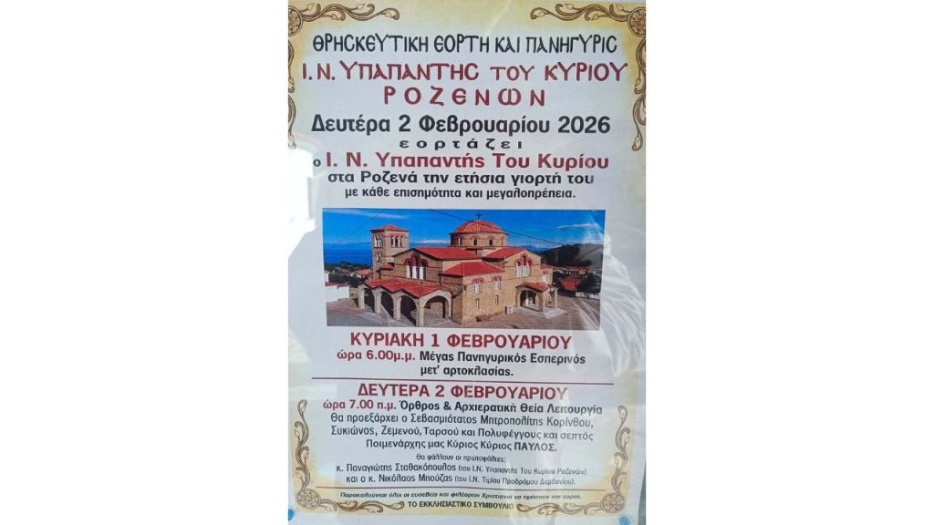 Με ιδιαίτερη λαμπρότητα και κάθε εκκλησιαστική μεγαλοπρέπεια, ο Ιερός Ναός Υπαπαντής του Κυρίου στα Ροζενά ετοιμάζεται να εορτάσει την ετήσια γιορτή του την Δευτέρα 2 Φεβρουαρίου 2026.