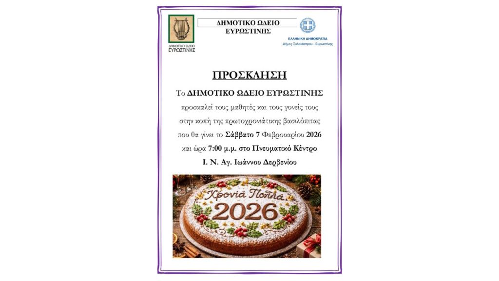 Το Δημοτικό Ωδείο Ευρωστίνης προσκαλεί τους μαθητές και τους γονείς τους στην κοπή της πρωτοχρονιάτικης βασιλόπιτας που θα γίνει το Σάββατο 7 Φεβρουαρίου 2026 και ώρα 7:00 μ.μ. στο Πνευματικό Κέντρο Ι. Ν. Αγ. Ιωάννου Δερβενίου