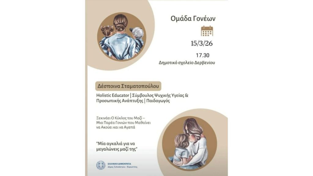 Αυτή την Κυριακή, οι γονείς του Δήμου μας έχουν την ευκαιρία να συμμετάσχουν στην εκδήλωση στο Δερβένι στο Δημοτικό Σχολείο (ώρα 17:30): Η Δέσποινα Σταματοπούλου, Holistic Educator – Σύμβουλος Ψυχικής Υγείας & Προσωπικής Ανάπτυξης – Παιδαγωγός, συνεχίζει τη δράση της Ομάδας Γονέων: «Ο Κύκλος του Μαζί» Με κεντρικό σύνθημα «Μία αγκαλιά για να μεγαλώνεις μαζί της», η συνάντηση εστιάζει στη δημιουργία μιας ζεστής ομάδας γονέων που μαθαίνει να ακούει, να συνδέεται βαθιά και να προσφέρει αγάπη στα παιδιά με τρόπο υποστηρικτικό και ολιστικό.