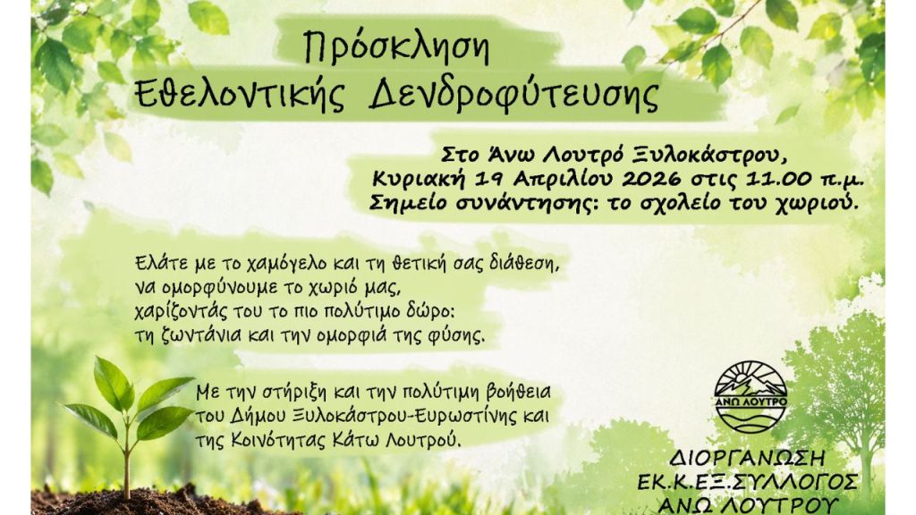 Ο Δήμος Ξυλοκάστρου-Ευρωστίνης ενημερώνει ότι ο Σύλλογος Άνω Λουτρού διοργανώνει δράση δενδροφύτευσης, η οποία θα πραγματοποιηθεί την Κυριακή 19 Απριλίου 2026 στο Άνω Λουτρό.